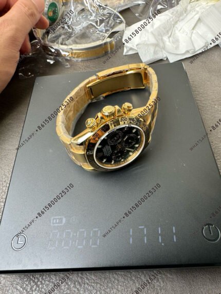 Products Introduction Case Diameter 40mm Thickness 12.5mm Bezel Tachymeter bezel Case Material 18k yellow gold plated 1:1 replicated solid 904L